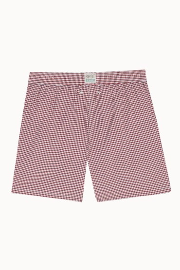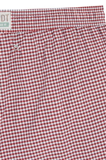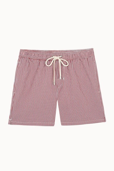 Men's swimsuit made of polyamide. Red and gray checkered fabric.
