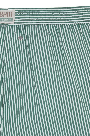 Men's Khaki and Ecru Striped Swimsuit Men's swim shorts in khaki green and off-white striped seersucker fabric. Features an elasticated waistband and adjustable drawstring. 100% Made in Barcelona.