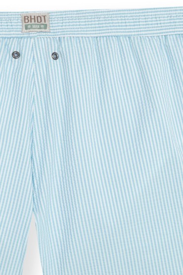Men's swimsuit made of polyamide.  Seersucker fabric in blue and ecru stripes.