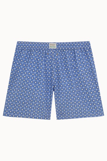 Men's Blue Swim Shorts with Tie-Style Paisley Print  Men's swim shorts in dark lavender blue plain fabric with a tie-style paisley print. Features an elasticated waistband and adjustable drawstring. 100% Made in...