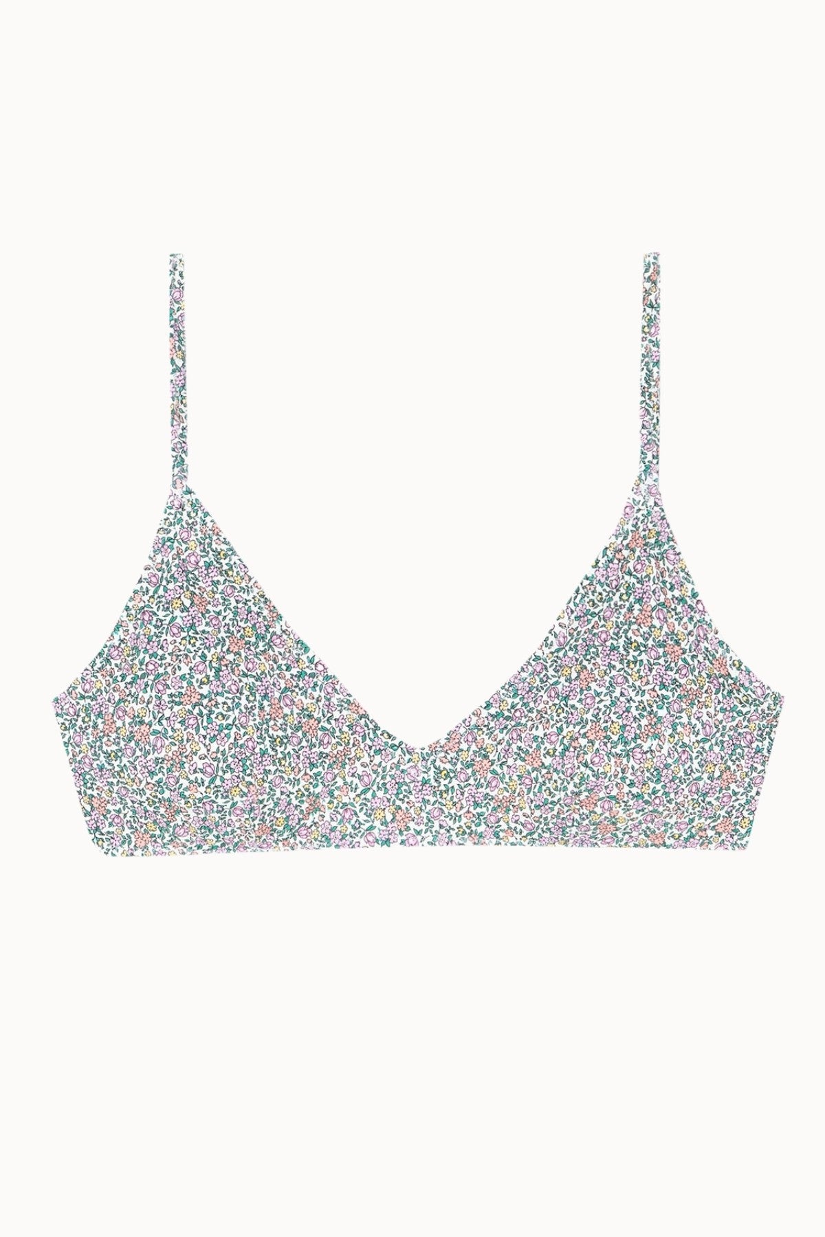 Closed bikini top with V-neckline. Mini floral print in green, pink, orange and yellow tones.