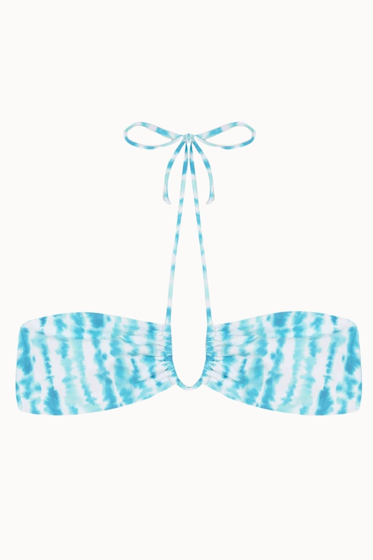 Made in a print that greatly highlights the tan of the skin: a tie-dye in the entire range of turquoise blues. The Amalfi Top Moss is the new top-trend silhouette for this summer.