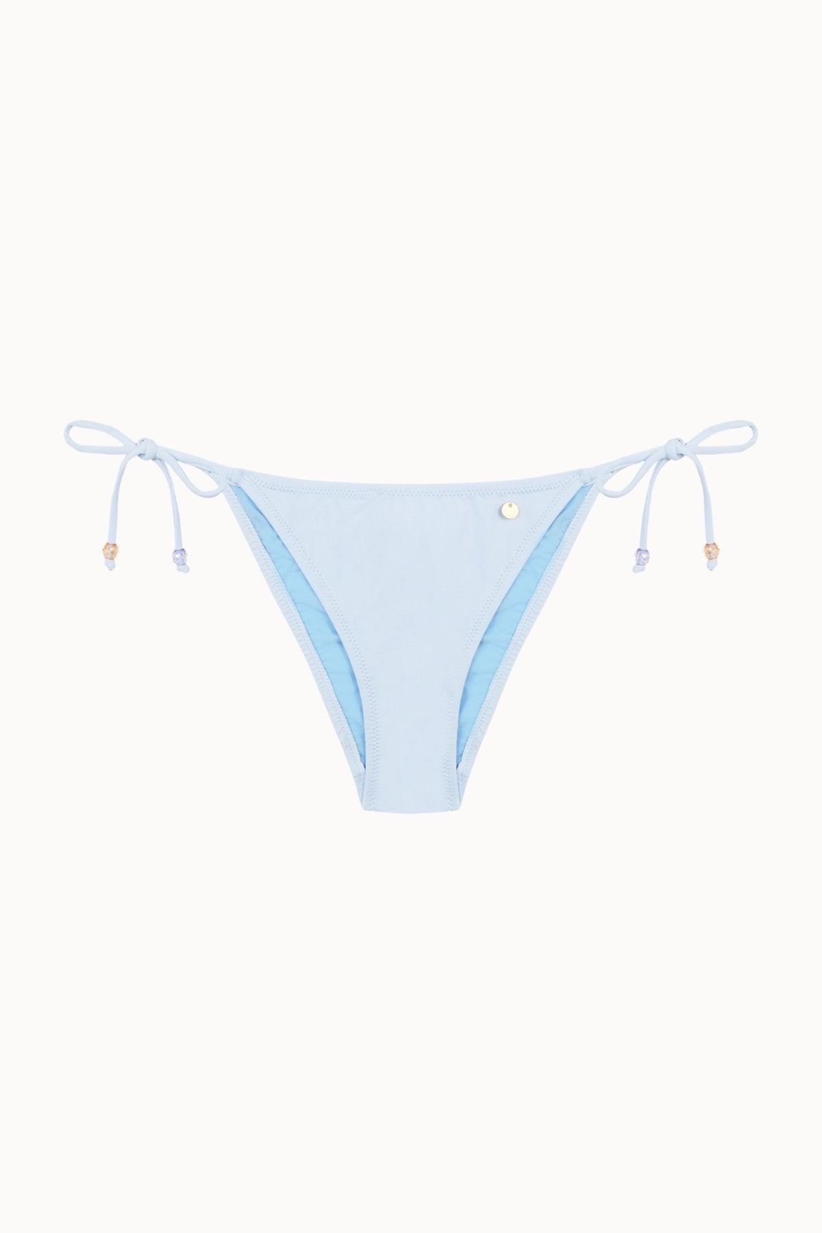 The Azur Bottom Tie Bol is a semi-Brazilian bikini bottom with side ties and colourful beads at the ends of the strings. A feminine and playful design in smooth sky-blue fabric.