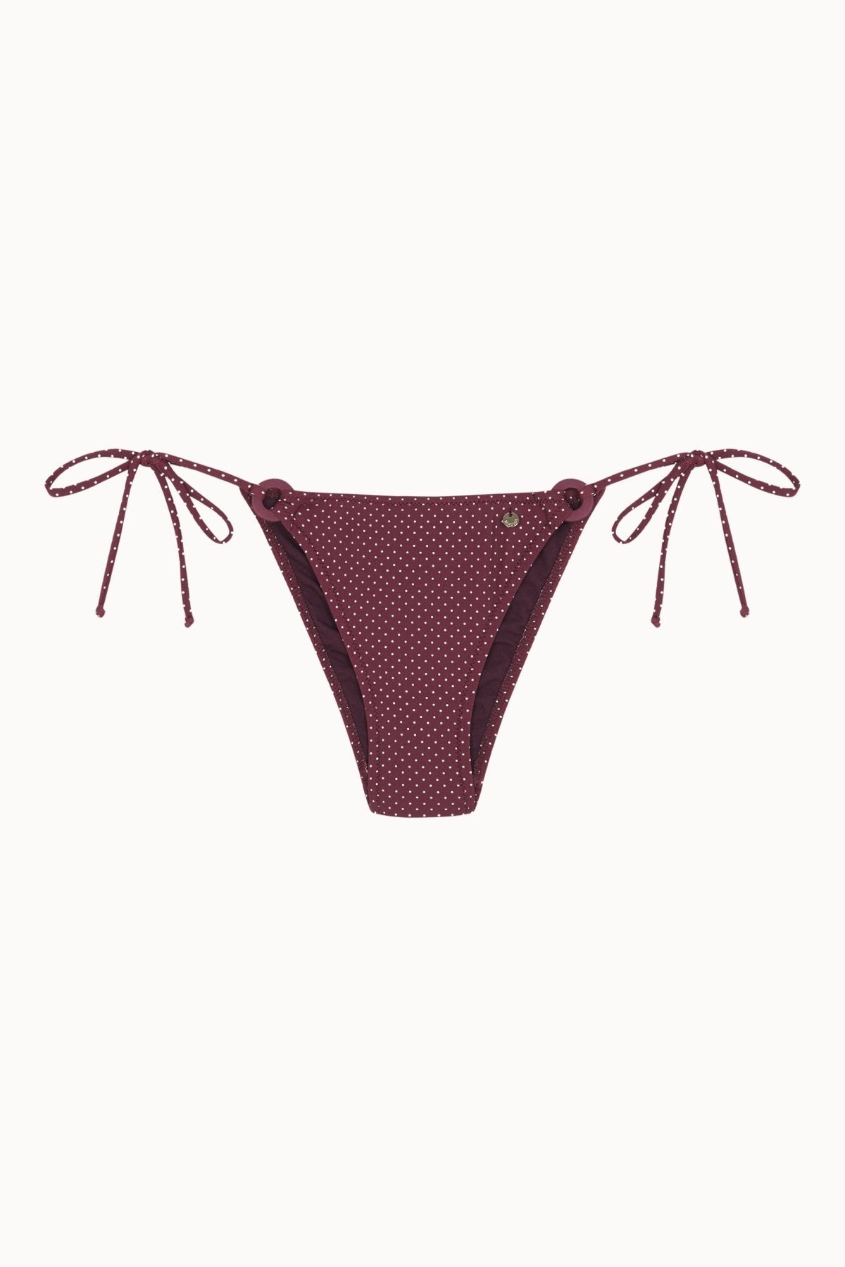 The Bonbon Bottom Aro is a semi-Brazilian bikini bottom with side ties and burgundy rings matching the print. Pair it with the Bonbon Top TR Aros for a coordinated and feminine total look.