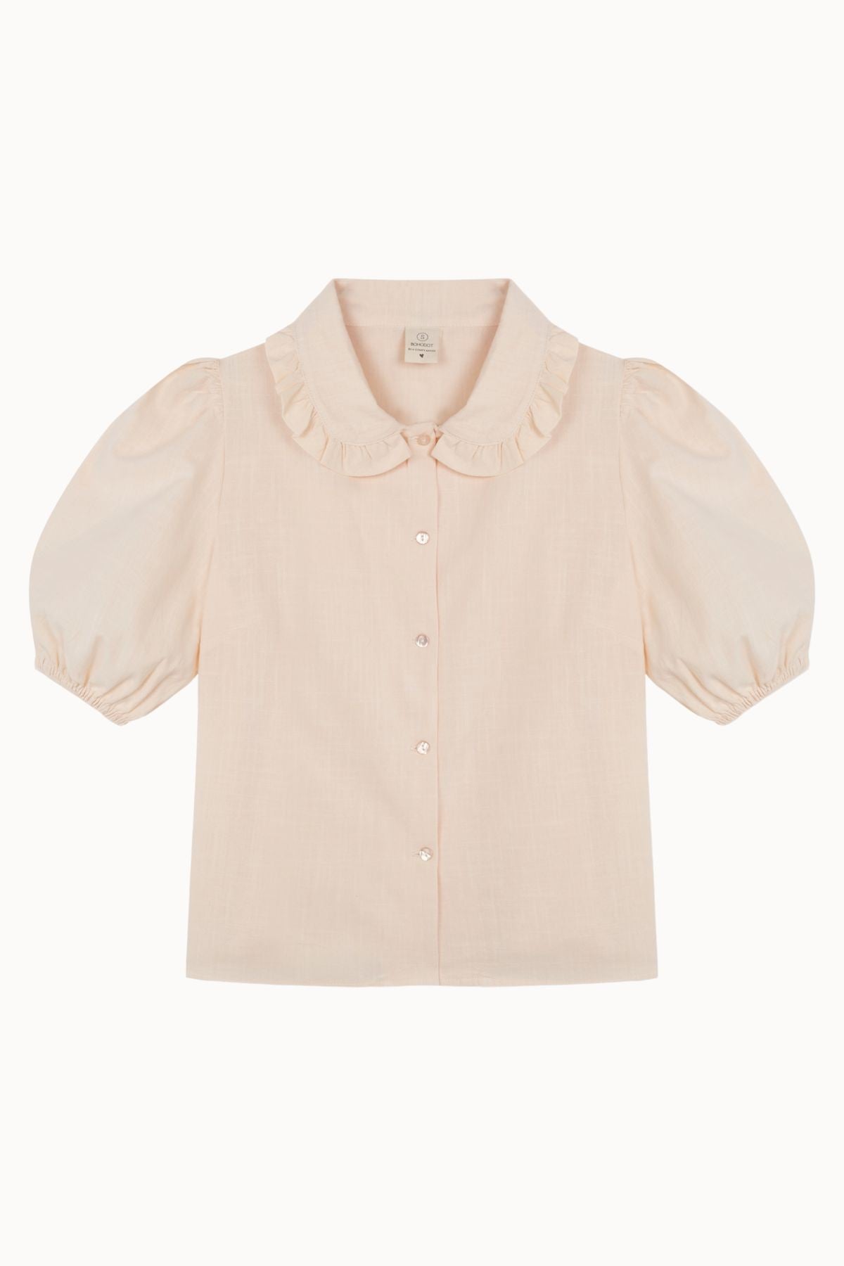 Short-sleeved shirt with puff sleeves and a buttery ruffled collar.