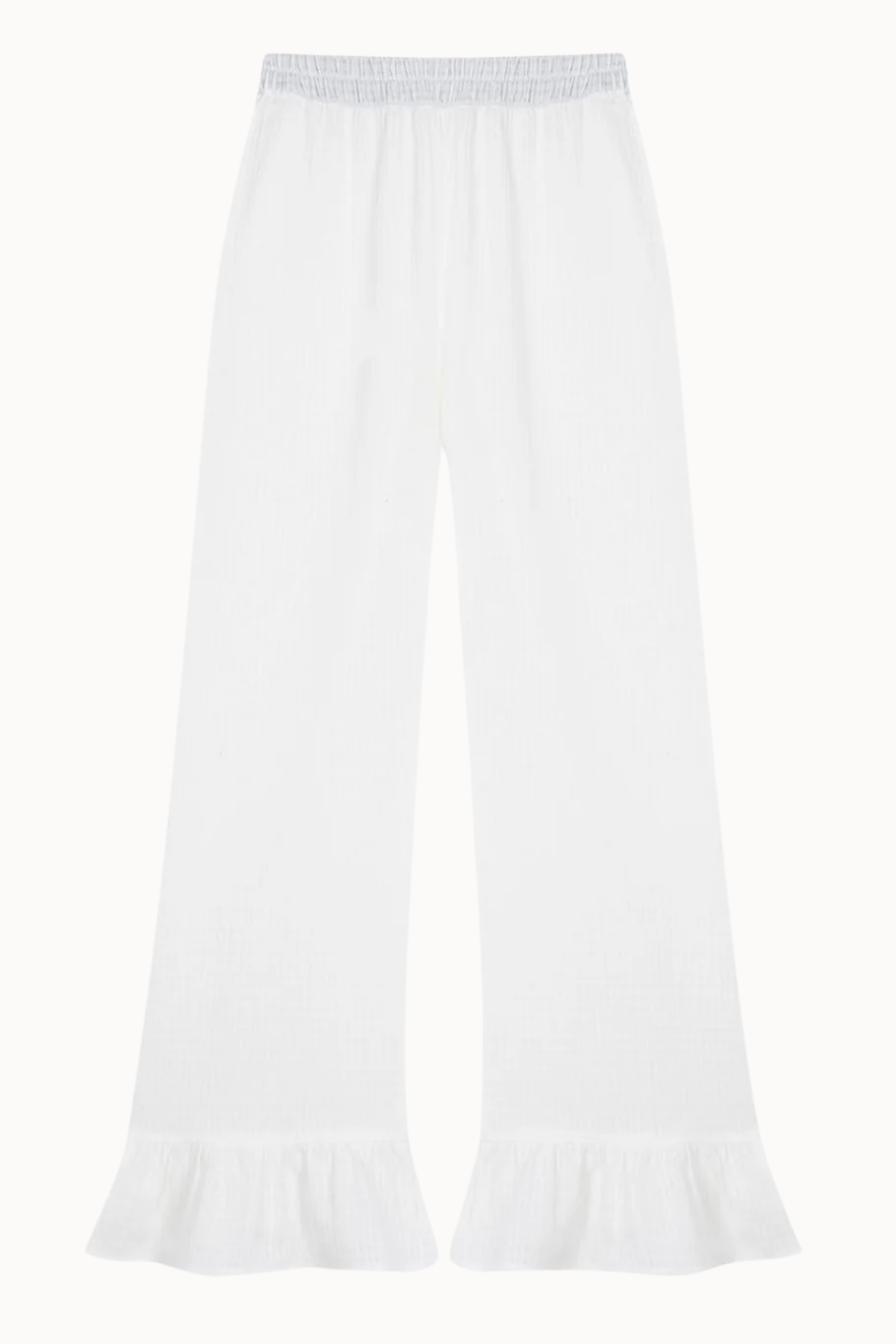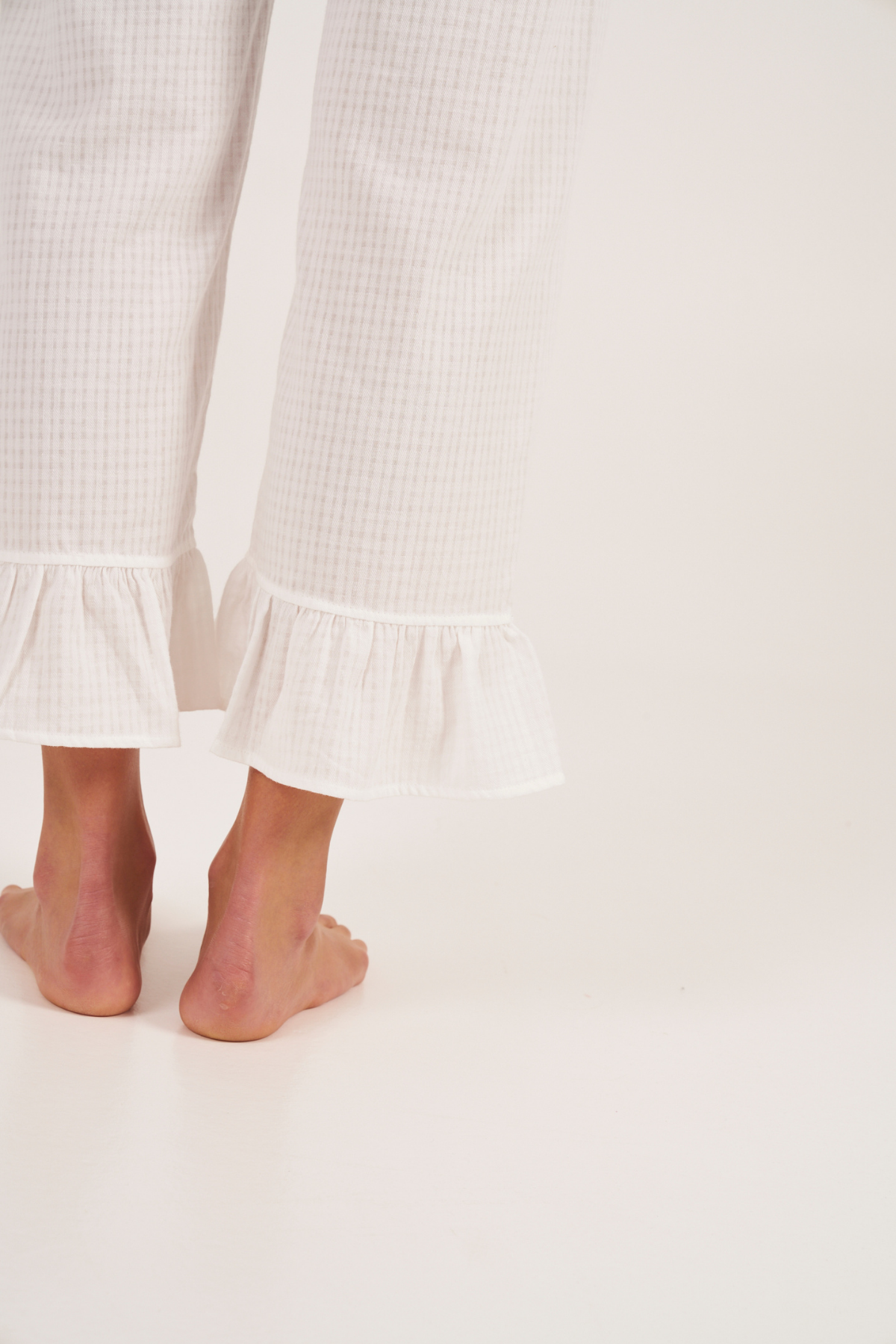 Long pyjama pants with ruffles, made with white seersuker fabric.