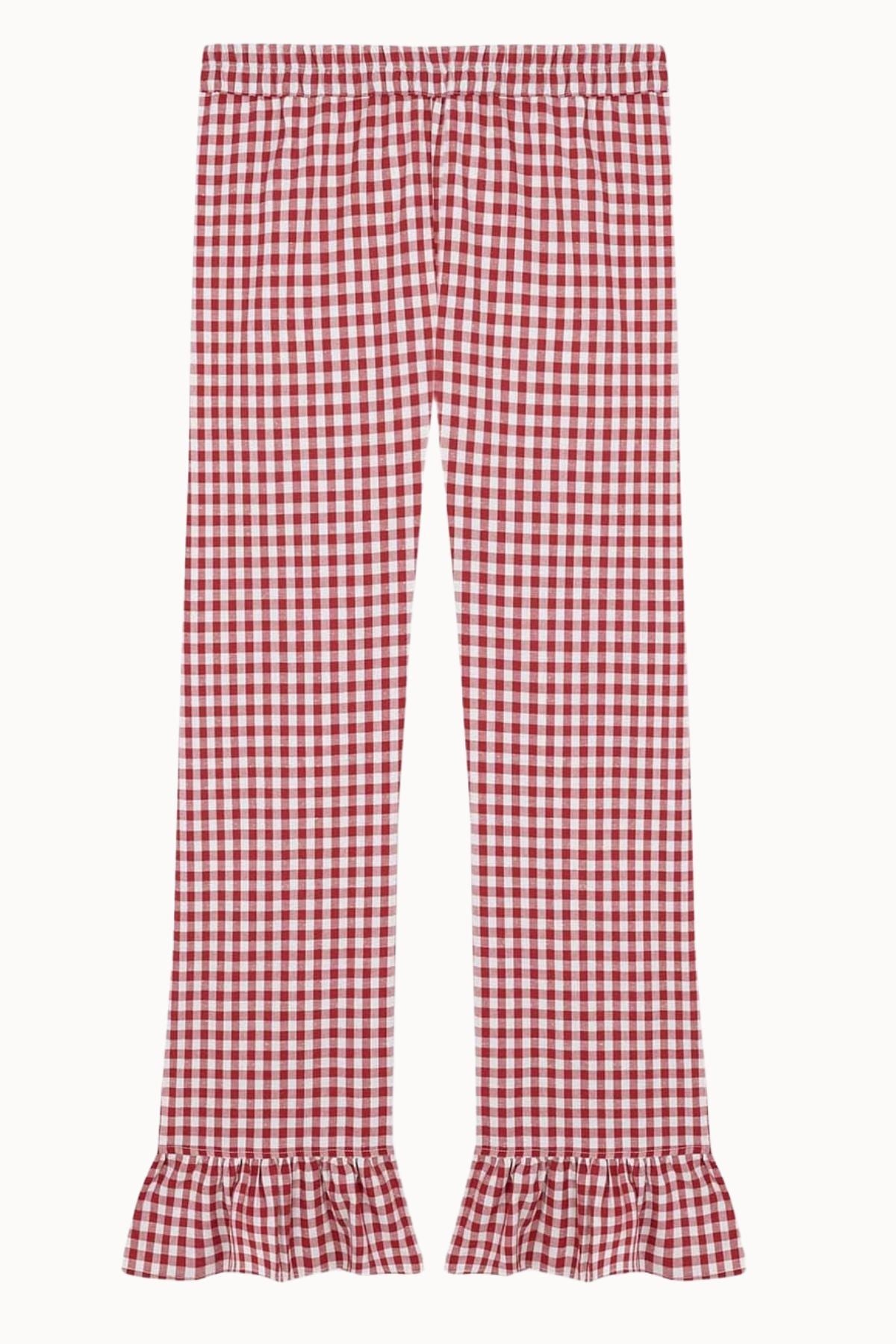 Pyjama pants with ruffles at the hem. Crafted from red and beige checkered cotton fabric.
