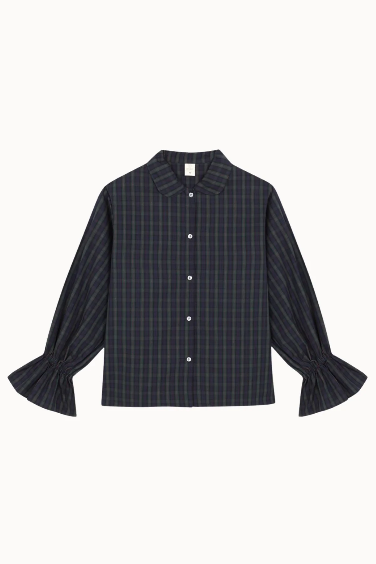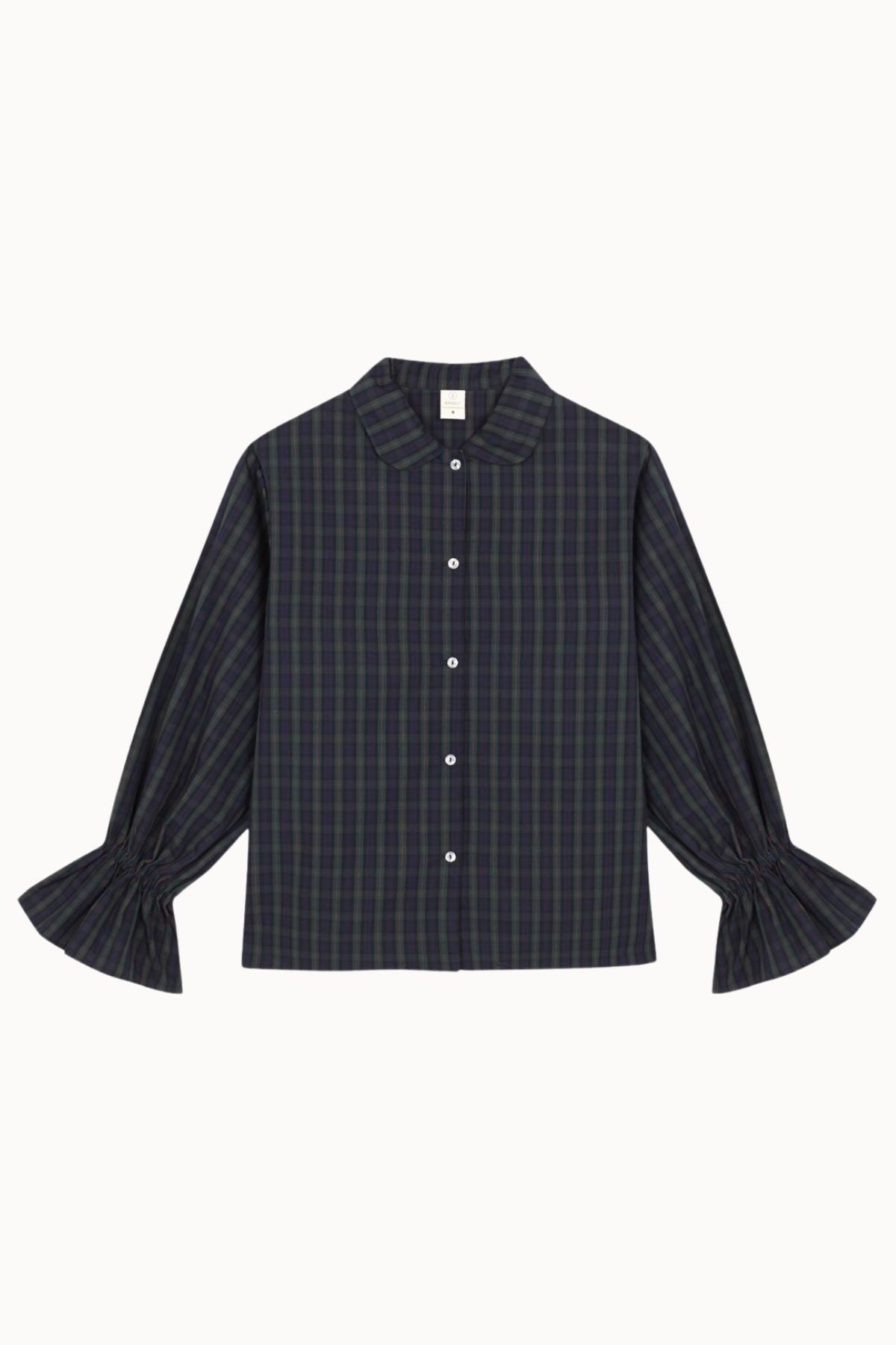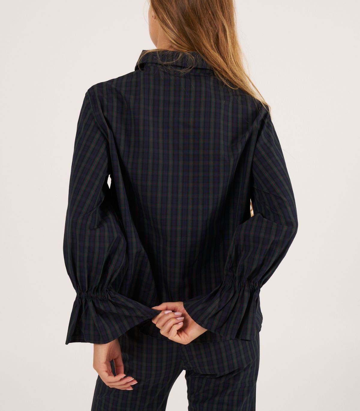 Long-sleeved shirt with ruffled cuffs, made from madras check fabric in navy blue and green tones.