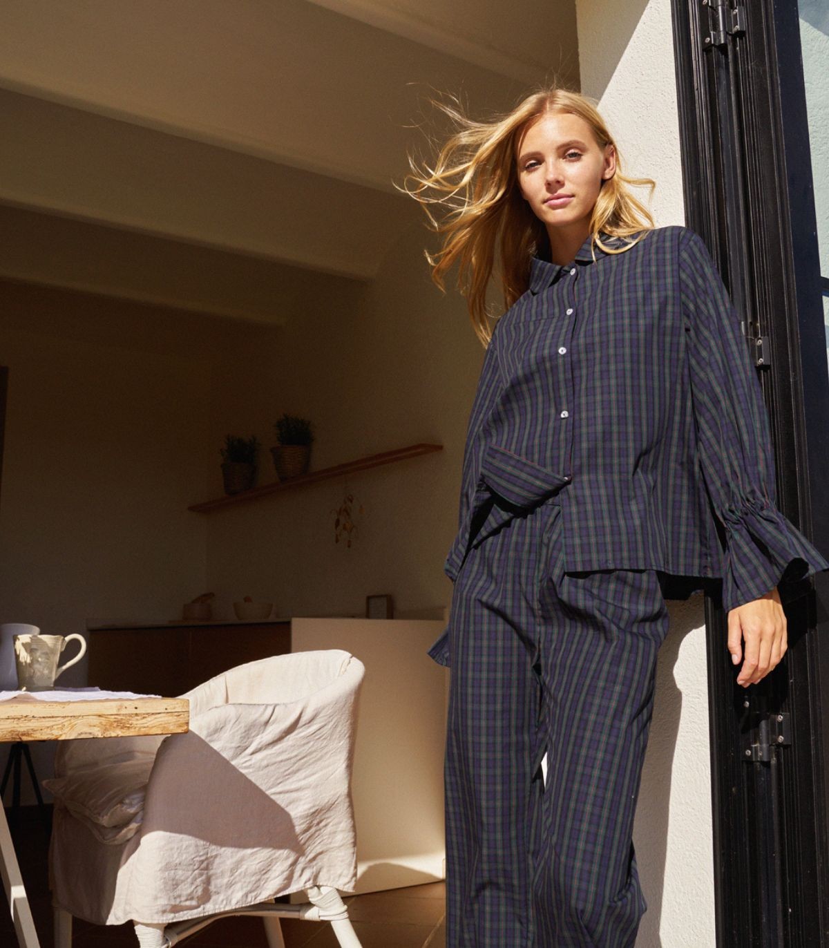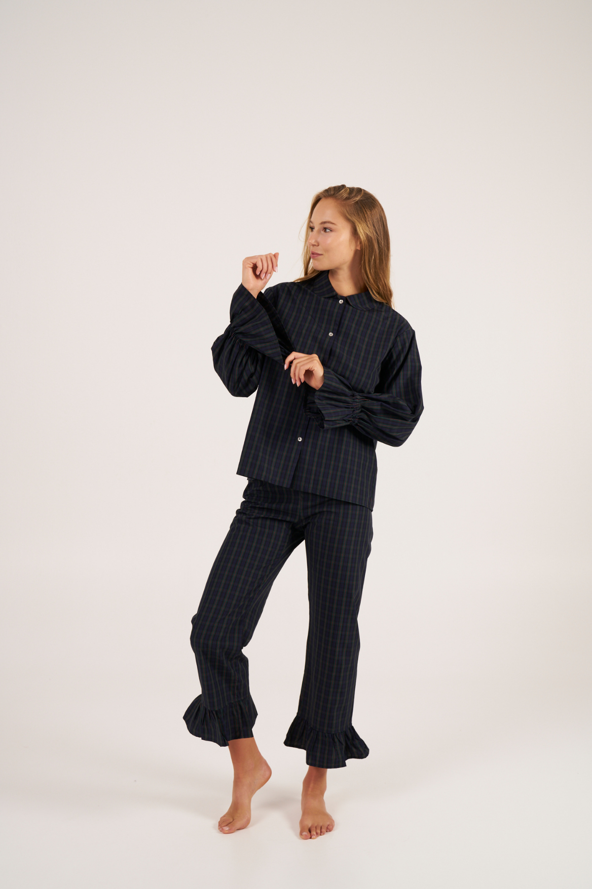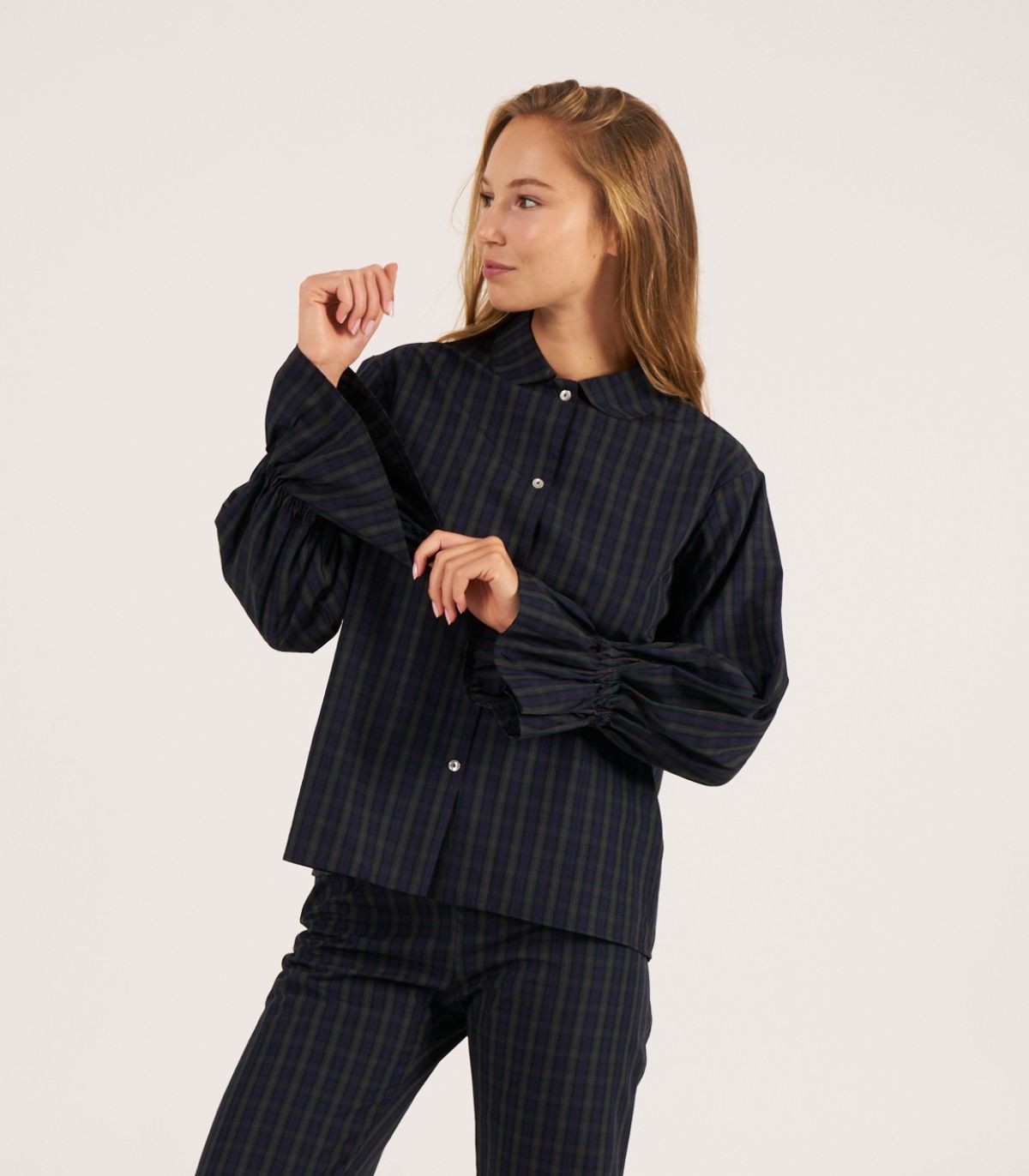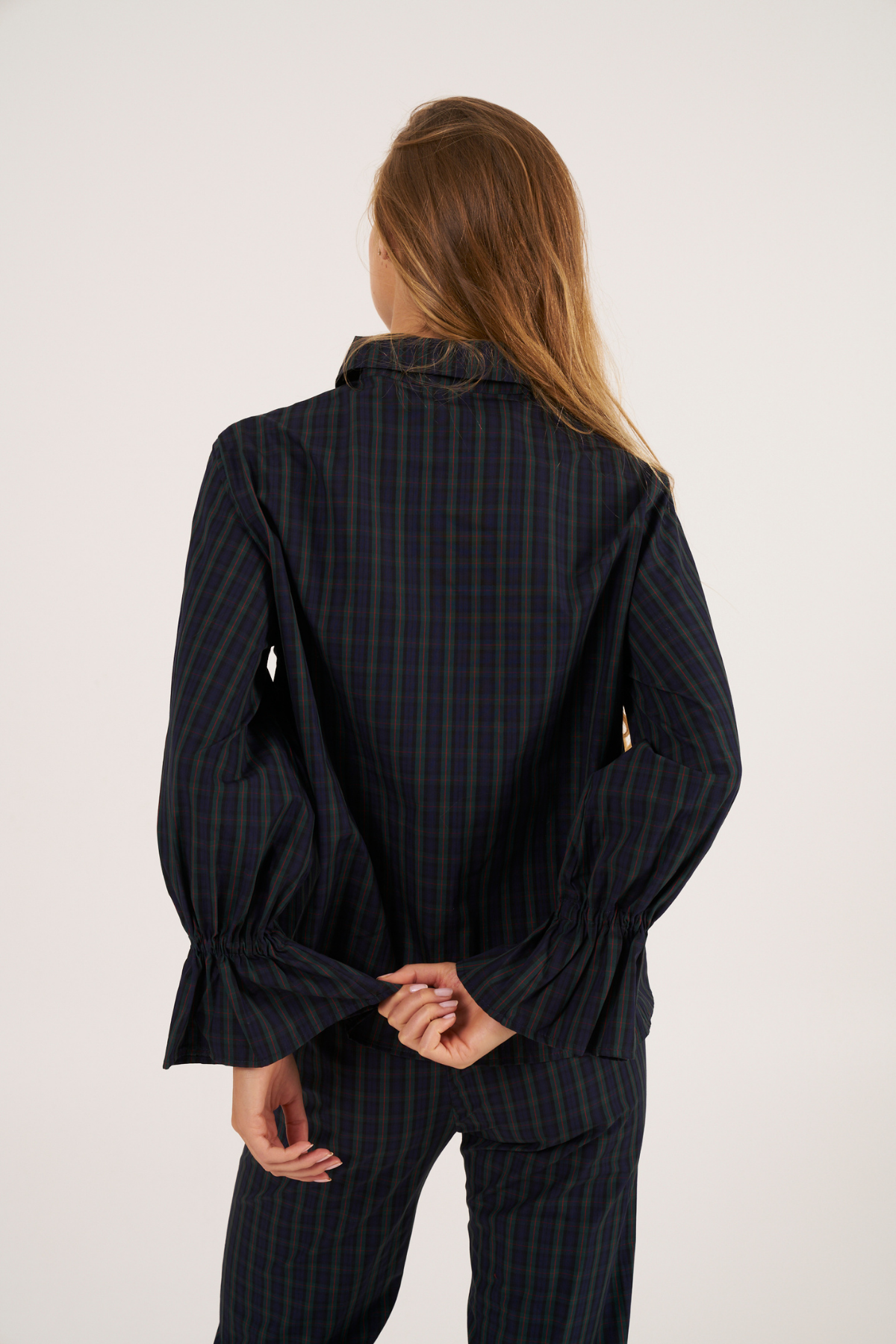 Long-sleeved shirt with ruffled cuffs, made from madras check fabric in navy blue and green tones.