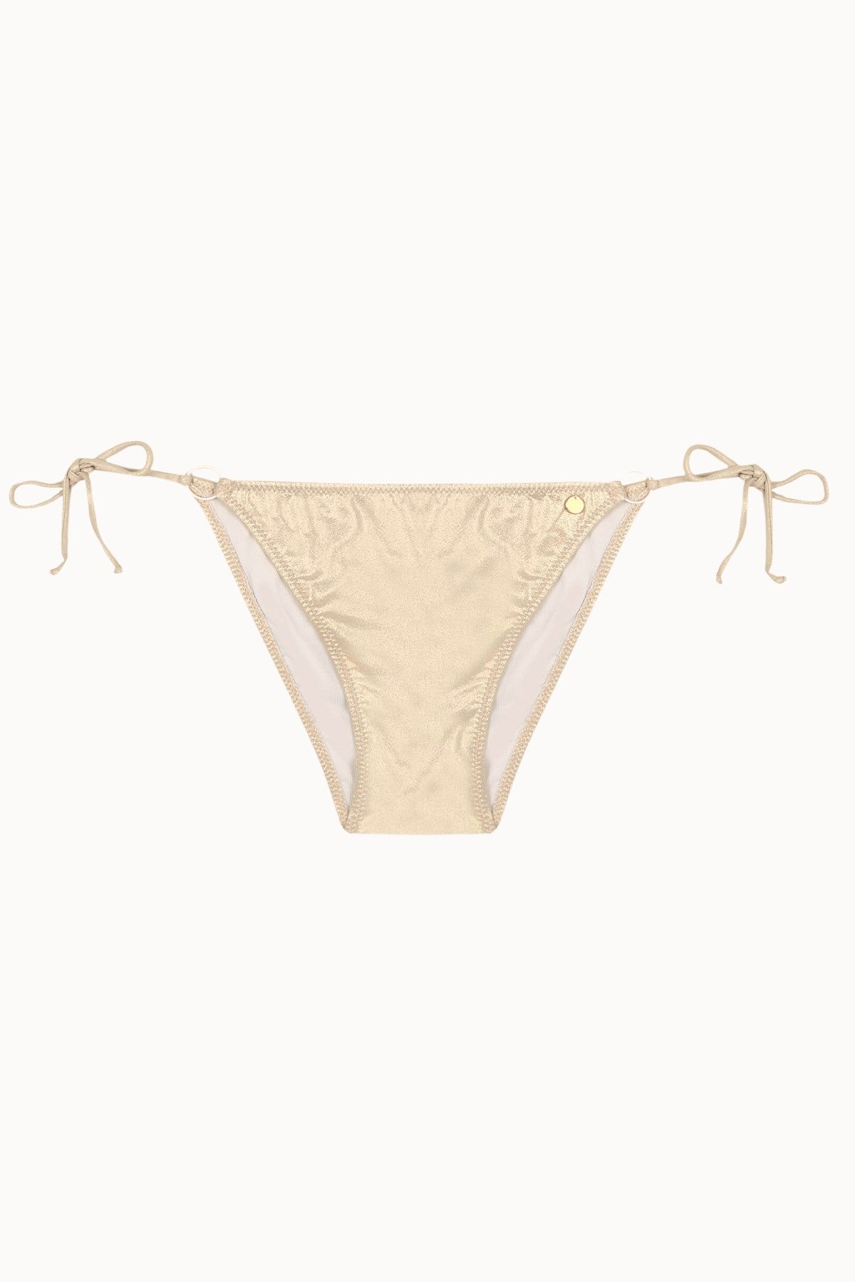 Brazilian bikini bottom that is tied at the sides with an adjustable tie and has two golden metal rings on each side. ‘Brilli-brilli’ fabric in light gold color.