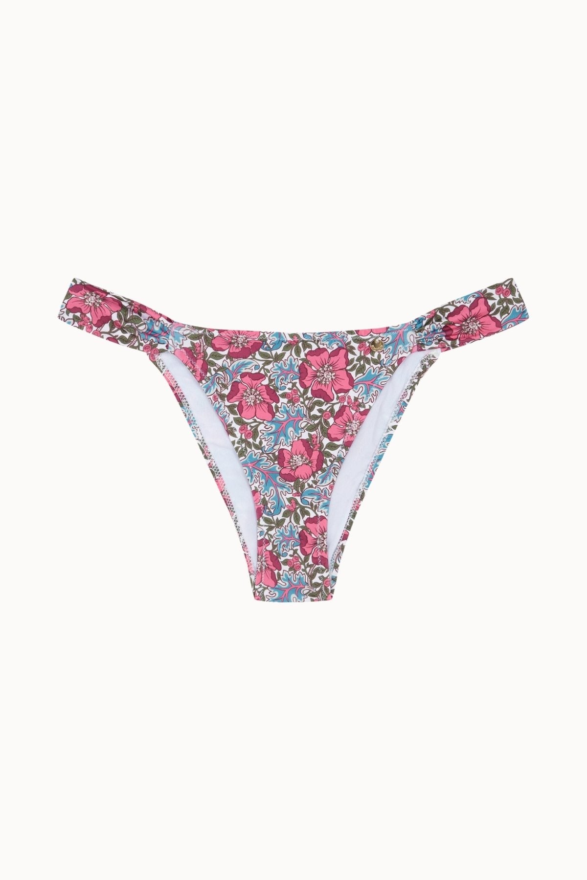 The Millie Bottom Sand is a Brazilian bikini bottom with shirred side straps that do not mark the hips and create a smooth, flattering silhouette. The Liberty floral print adds a delicate and romantic feel.