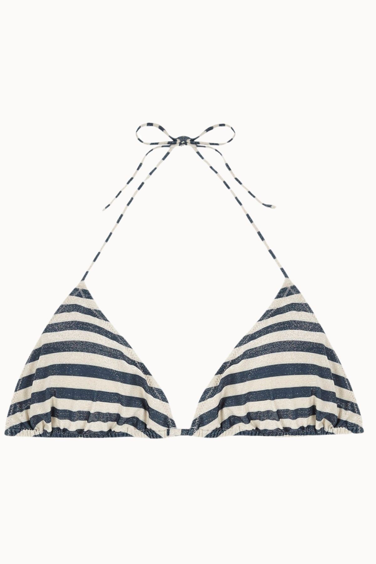 Feel the summer with the Milos Top TR bikini. With a striped design in bluish green and gold in lurex. Thin straps that you can tie and adjust at the neck and back.