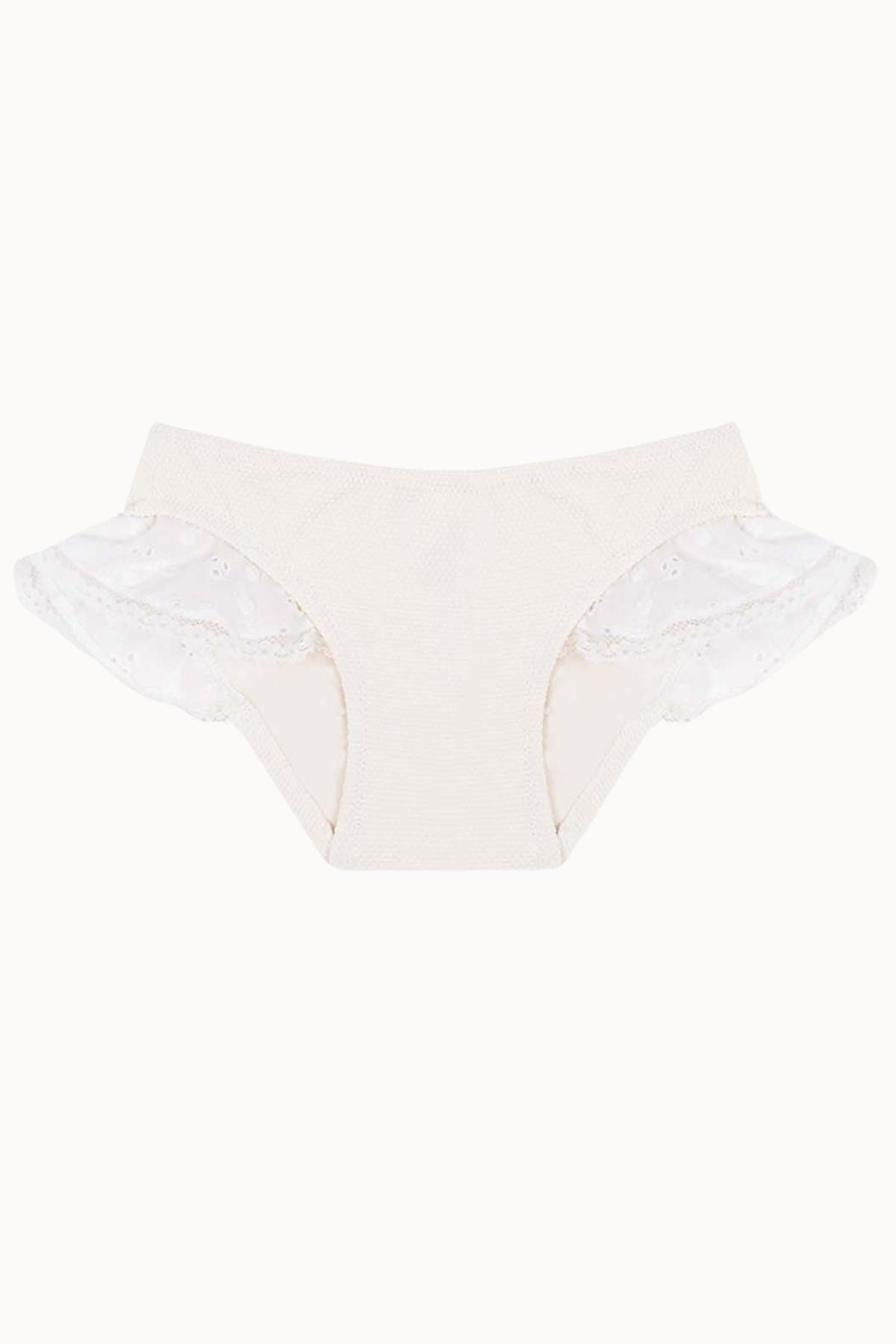Girl's bottom with ruffle and curly back. Ecru pique fabric and ruffles in Swiss embroidered cotton.