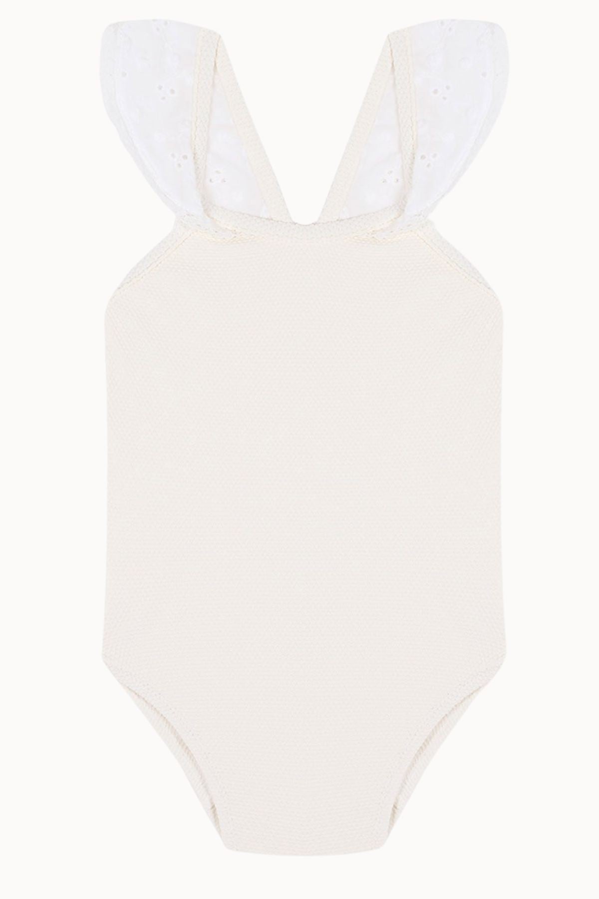 Girl's swimsuit with crossed back and ruffles on the straps. Ecru pique fabric and ruffles in Swiss embroidered cotton.