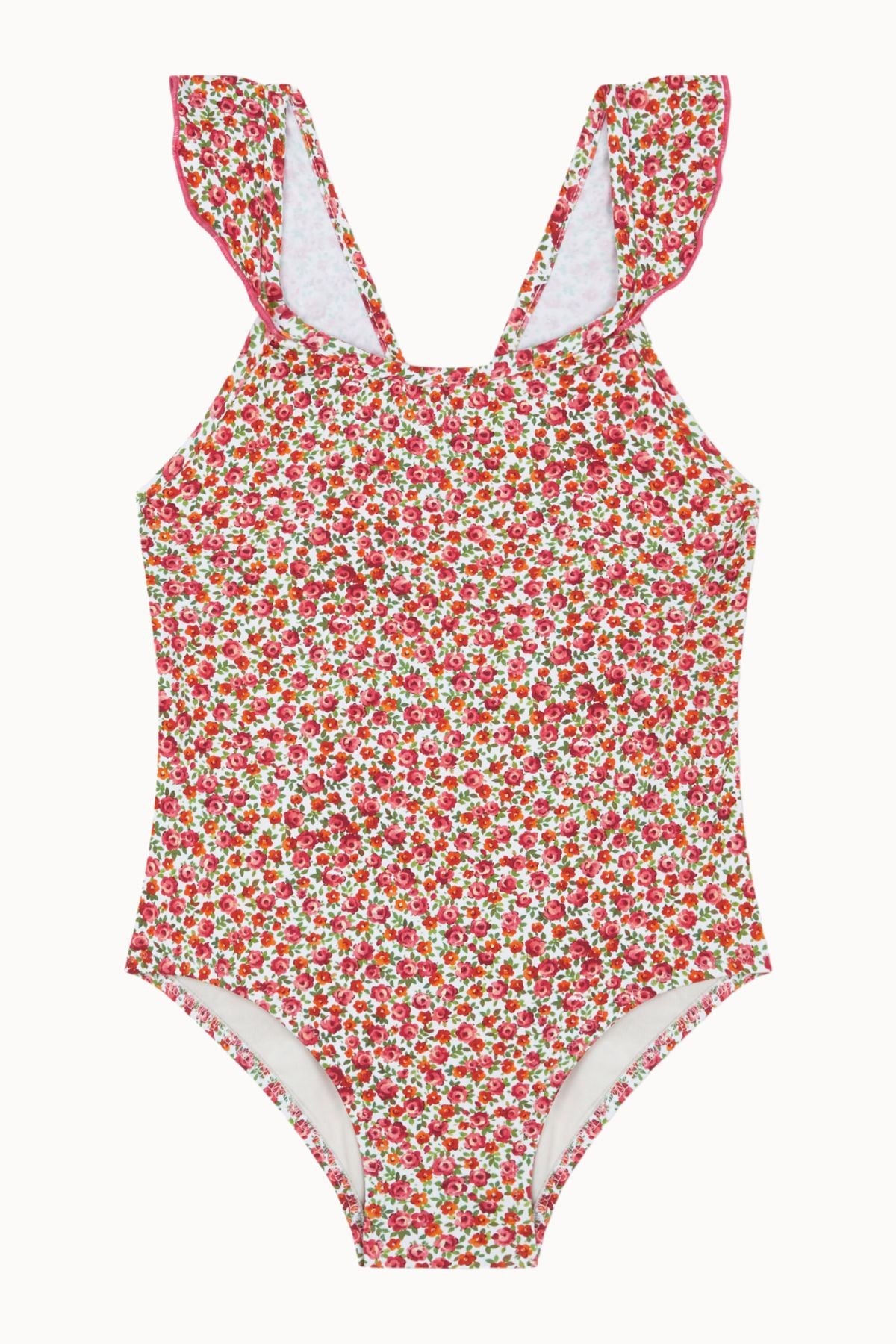 Girl’s Swimsuit with Crossed Back and Frilled Straps in an Orange Floral Print