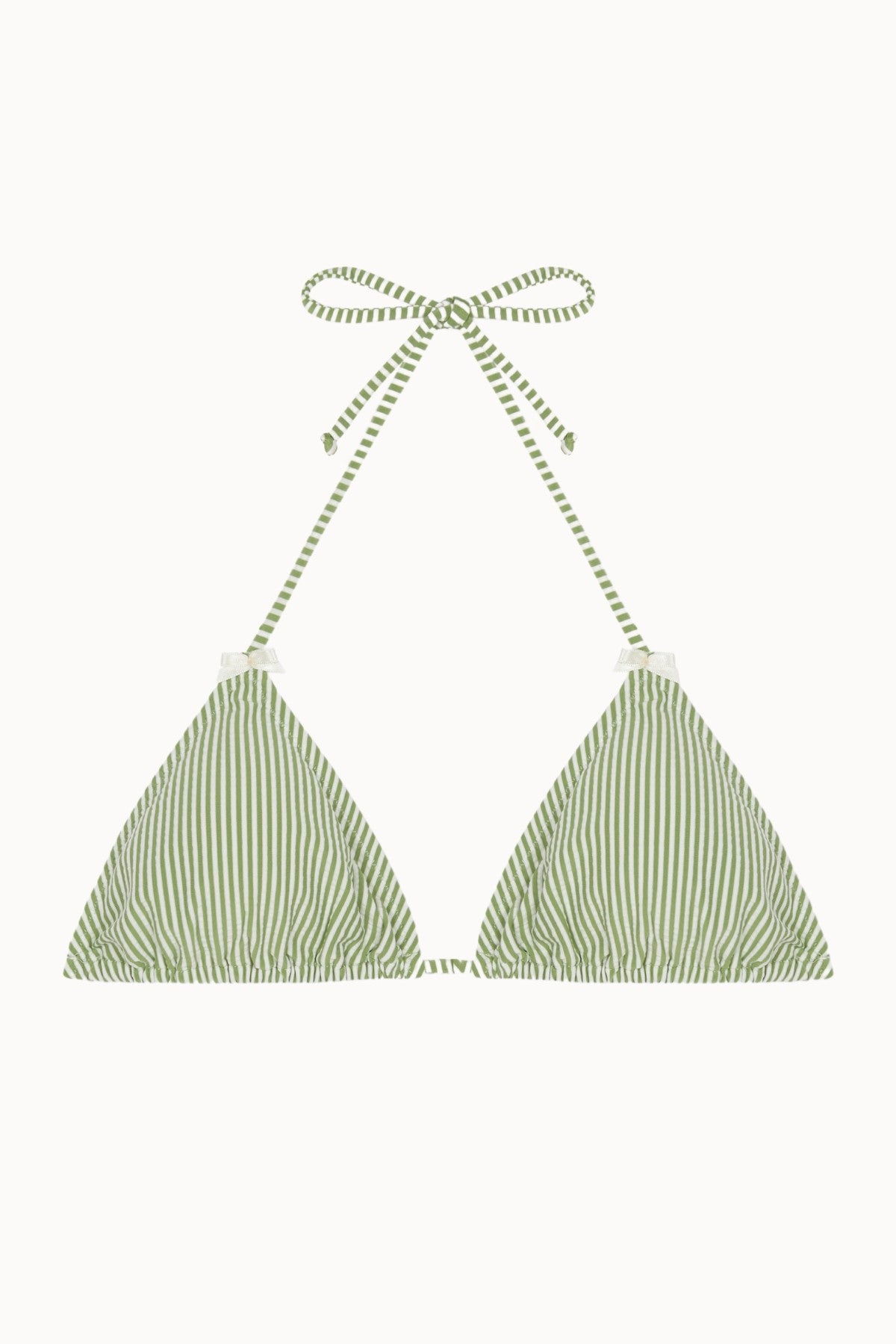 The classic triangle style gets a special touch with a bow on each strap. The Rosemary Top Tr Lazos is made from 100% recycled seersucker fabric, featuring a green and cream stripe, and adorned with two small cream bows at the top.