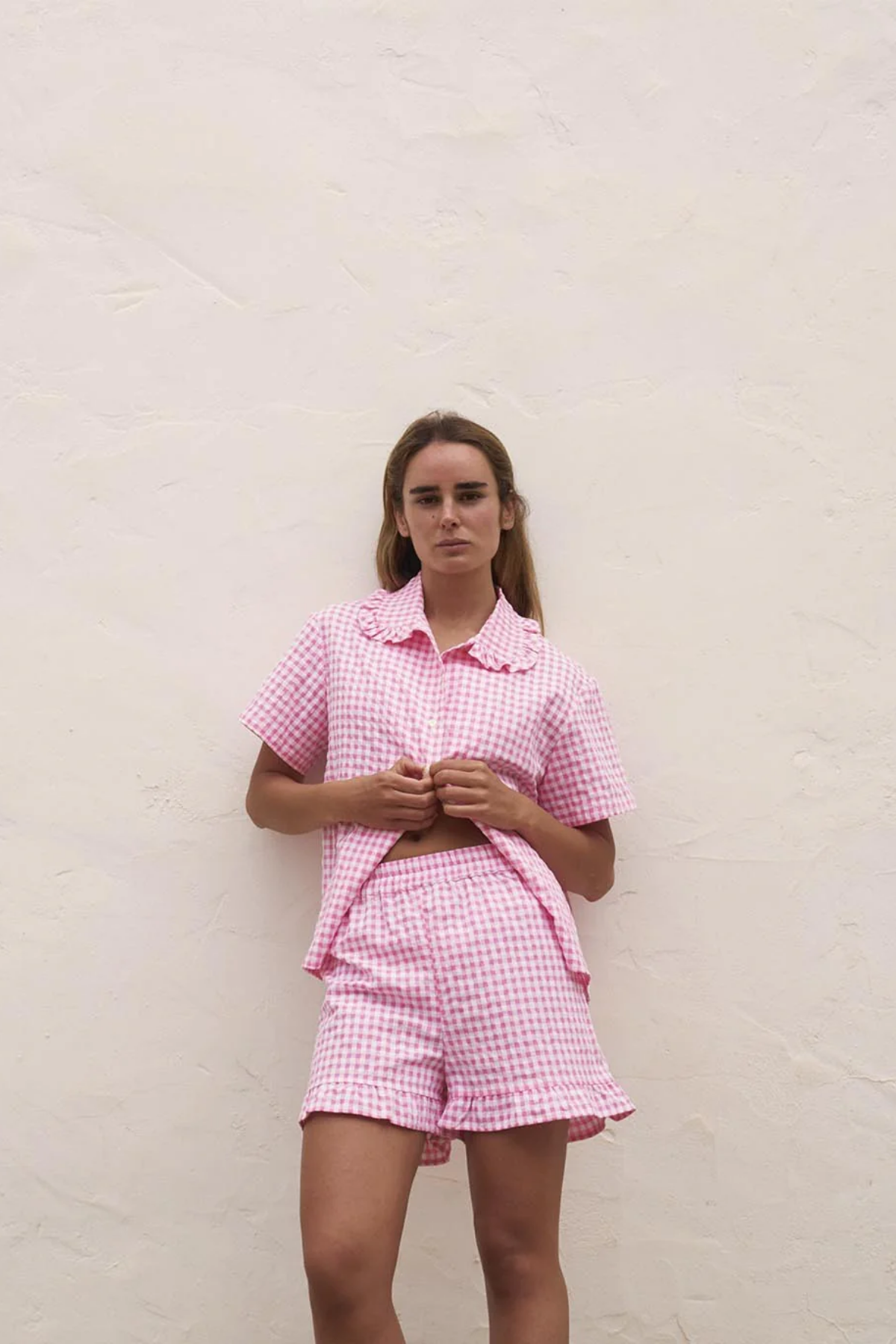 Short pyjama pants with ruffles, made with seersuker plaid fabric in pink and white.