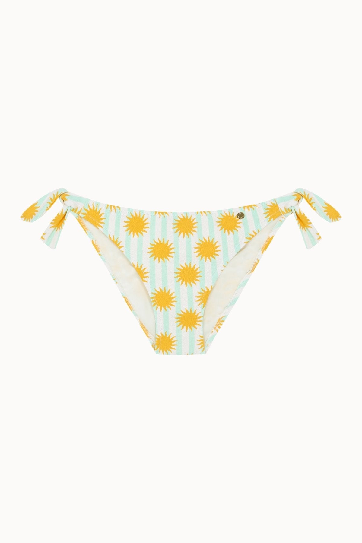 The Sole Bottom B/N is a classic-cut bikini bottom with side ties for a comfortable, adjustable fit. The yellow sun and aqua green stripe print on crepe fabric creates a cheerful and timeless summer style.