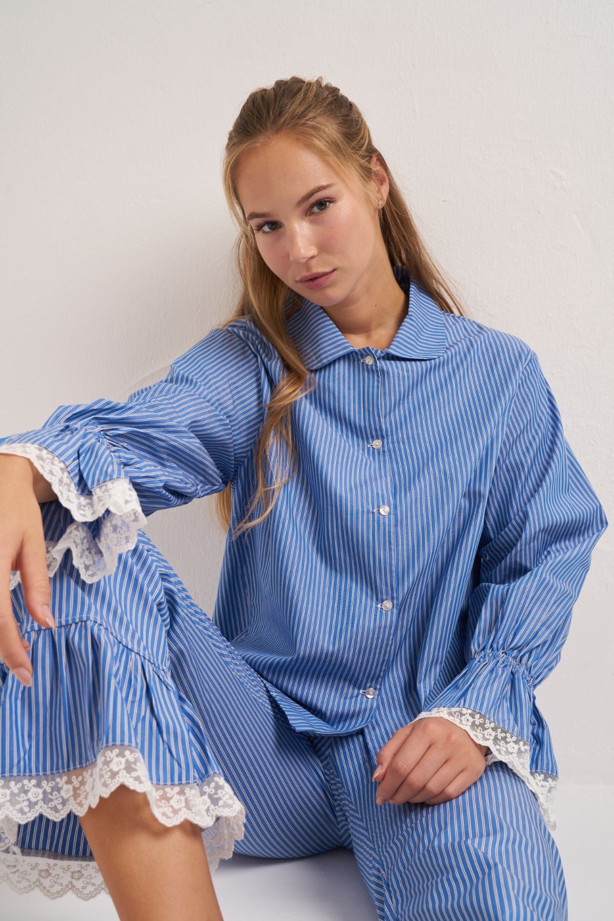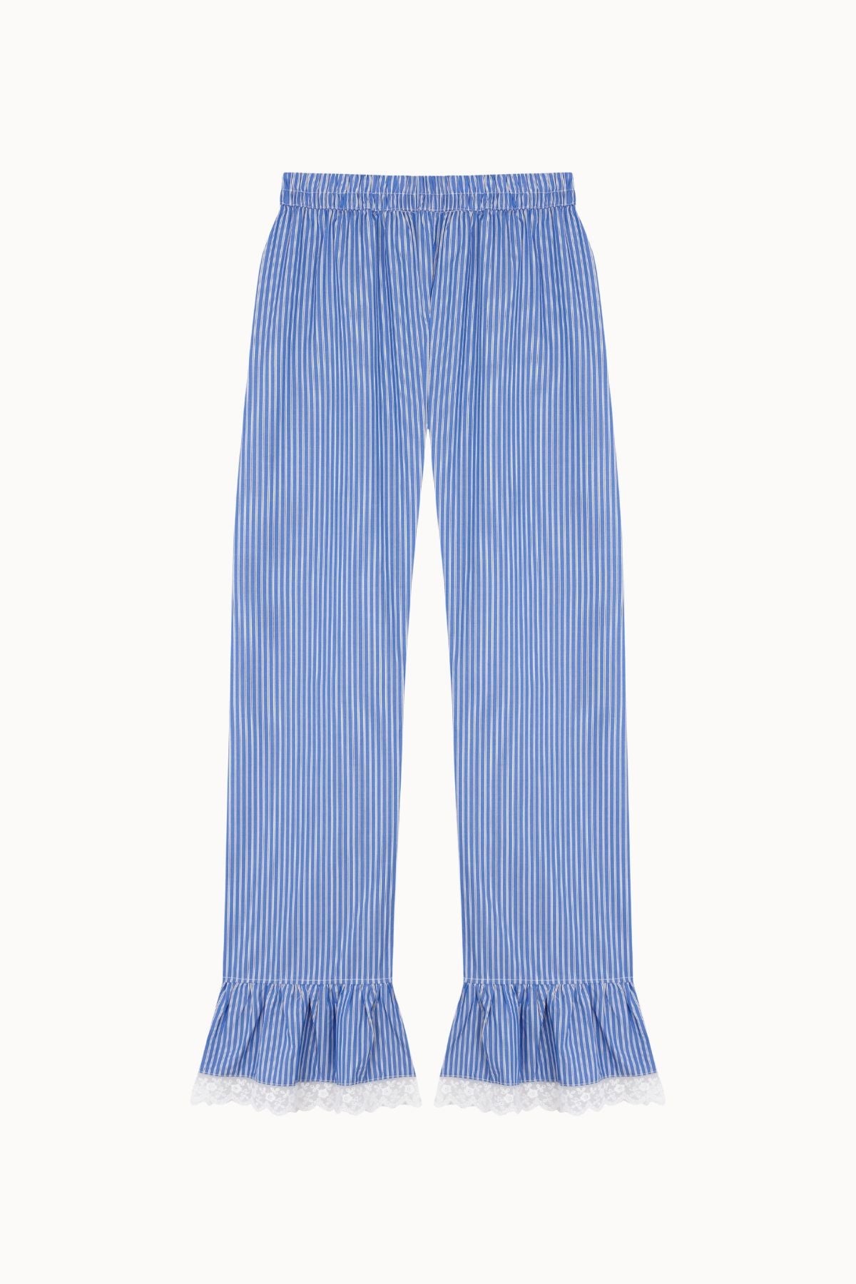 Cotton pants with fine blue and white stripes, a ruffle at the hem and lace trim. A romantic touch for your winter wardrobe.