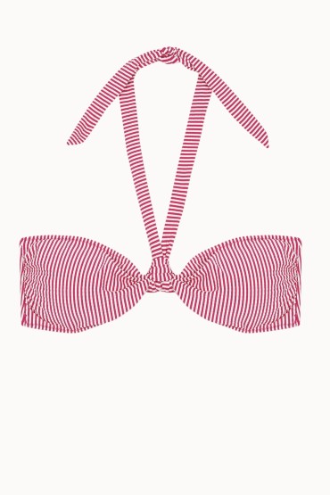 Bikini Bandeau con Escote Halter a Rayas Fucsia y Crudo Un nuevo patrón de bandeau, esta vez con un nudo en el centro que se ajusta al cuello creando un escote tipo halter muy favorecedor. Un bikini muy especial que...