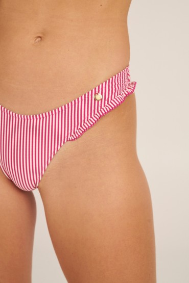 Braga de Bikini de Tiro Alto a Rayas Fucsia y Crudo Si buscas un bikini con un detalle romántico, la Cerise Bottom Uve Vol es perfecta para ti. En este tejido de seersuker con rayas verticales en fucsia y crudo tan...