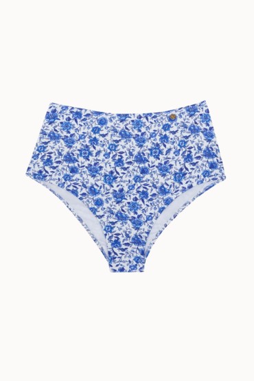 Bikini Braga Alta con Estampado Floral Azul Para las amantes de las braguitas de bikini altas, presentamos una versión estampada con flores en azul en fondo blanco. De corte clásico y tiro alto, la Claire Bottom Alta...