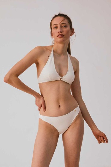 Bikini Halter de Color Crudo Un look veraniego que se convertirá en un fondo de armario. Esta pieza está confeccionada en nuestros talleres de confianza en Barcelona.