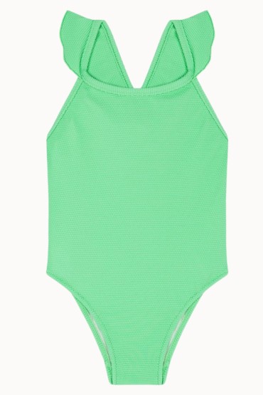 Bañador de niña con la espalda cruzada y volantes en los tirantes. Tejido de canalé en color verde lima. 100% Made in Spain.