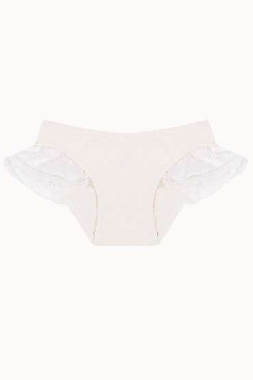 Braguita con volante para niña y parte de atrás rizada. Tejido de piqué crudo y volantitos en algodón de bordado suizo. 100% Made in Spain.