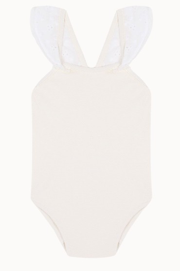 Bañador de niña con la espalda cruzada y volantes en los tirantes. Tejido de piqué crudo y volantitos en algodón de bordado suizo. 100% Made in Spain.