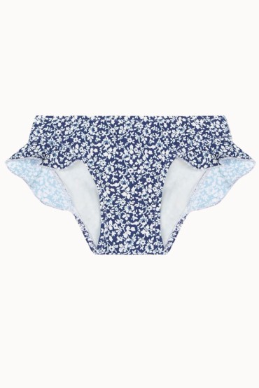 Braguita de Bikini para Niña con Volante y Fruncida en un Estampado Floral de Colror Azul  Braguita con volante para niña y con la parte de atrás fruncida confeccionada en un estampado floral en tonos azules....