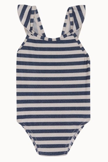 Bañador de niña con la espalda cruzada y volantes en los tirantes. Tejido en lúrex dorado con rayas azul marino.