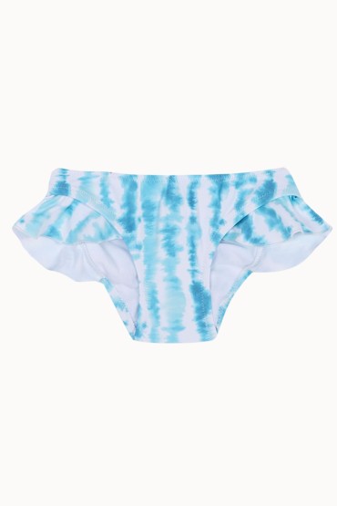 Braguita con volante para niña y parte de atrás rizada. Estampado tie-dye turquesa y blanco. 100% Made in Spain.