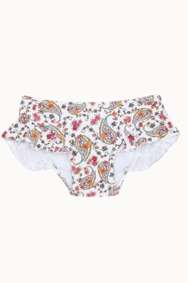 Braguita con volante para niña y parte de atrás rizada. Tejido con estructura arrugada y estampado boho de cashemeres en fondo blanco. 100% Made in Spain.