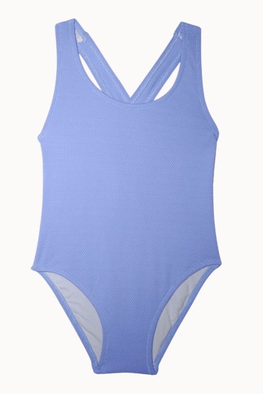 Bañador de niña  cruzado por la espalda para la comodidad de la niña. Tejido de piqué color azul lavanda.   100% made in Spain. Viene en una bolsita de algodón orgánico.