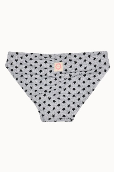 Braguita de niña en estampasdo gris vigoré y estrellitas negras. Parte de atrás rizada. Parte delantera forrada a tono.