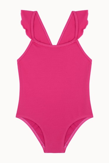 Bañador de niña con la espalda cruzada y volantes en los tirantes. Tejido de lúrex fucsia. 100% Made in Spain.