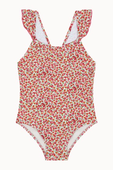 Bañador de niña con volantito y cruzado por la espalda para la comodidad de la niña. Estampado de flores grandes en tonos naranjas, granates y lilas sobre un fondo crudo con un brillante muy sutil.