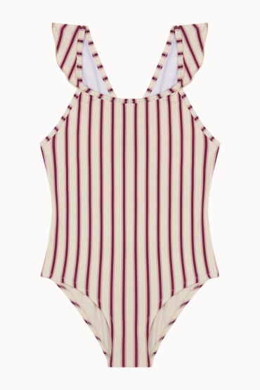 Bañador para Niña con la Espalda Cruzada y Volantes a Rayas Verticales de Color Vainilla y Rosa  Bañador de niña con la espalda cruzada y volantes en los tirantes. Confeccionado en un tejido 100% reciclado con rayas...