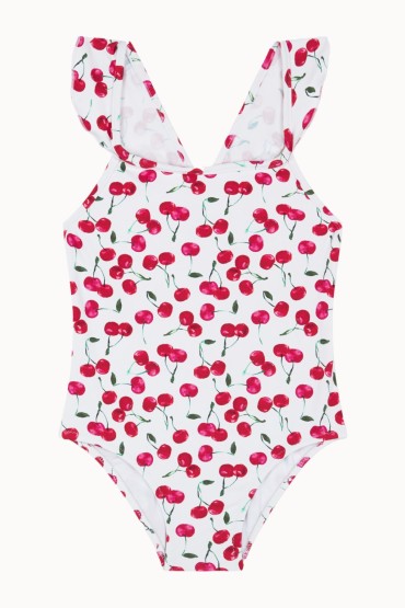 Bañador para Niña con la Espalda Cruzada y Volantes en los Tirantes en un Estampado de Cerezas  Bañador de niña con la espalda cruzada y volantes en los tirantes en el estampado más dulce de la colección, Picota. Un...