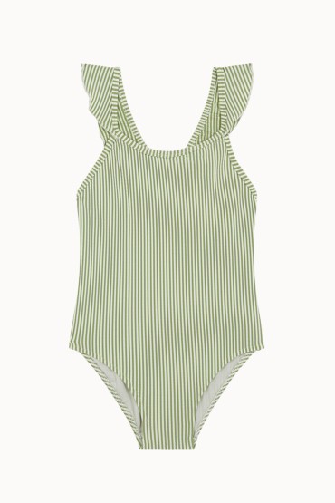 Bañador para Niña con la Espalda Cruzada y Volantes en los Tirantes a Rayas de Color Verde y Crudo  Bañador de niña con la espalda cruzada y volantes en los tirantes. Con una raya verde y cruda como protagonista en un...