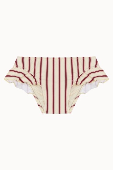 Braguita de Bikini para Niña con Volante y Fruncida a Rayas Verticales de Color Vainilla y Rosa  Braguita con volante para niña y con la parte de atrás fruncida confeccionada en un tejido 100% reciclado con rayas...