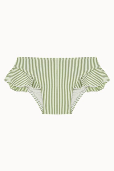 Braguita de Bikini para Niña con Volante y Fruncida a Rayas de Color Verde y Crudo  Braguita con volante para niña y con la parte de atrás fruncida confeccionada en un tejido de seersucker 100% reciclado a rayas...