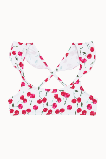 Top de Niña con Volantes en los Tirantes en un Estampado de Cerezas  Top de niña con volantes en los tirantes confeccionado en nuestro estampado de cerezas en un tejido 100% reciclado. Disponible a conjunto para mujer.