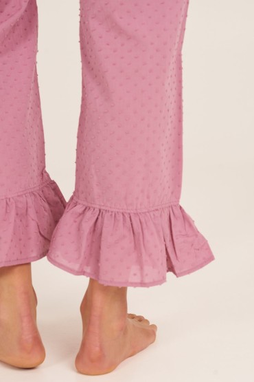 Pantalón de pijama con volantes en los tobillos. Está confeccionado con tejido de plumeti en color rosa. 100% algodón. 100% hecho en España.