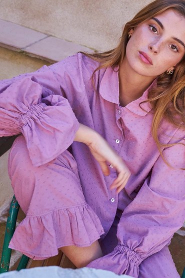 Camisa de pijama con volantes en los puños, confeccionada en tejido satinado de color lavanda con un estampado floral en tonos crudos y rosas. Este modelo está 100% hecho en España.
