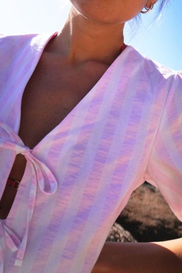 Camisa de Manga Corta Ajustable de Rayas Verticales Rosas y Blancas Camisa de manga corta con mangas abullonadas y detalle de los tres lazos ajustables en la parte delantera. Está confeccionada con tejido de rayas...