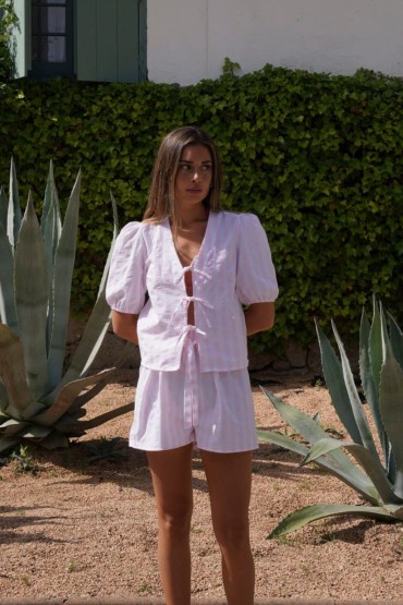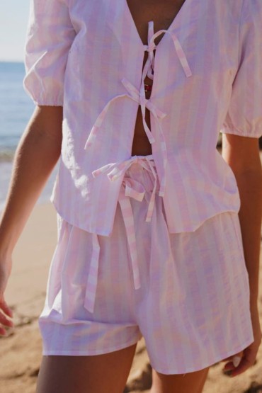Pantalón Corto de Rayas Verticales Rosas y Blancas Pantalón de pijama corto confeccionado con tejido de rayas verticales rosas y blancas. 100% algodón. 100% hecho en España.