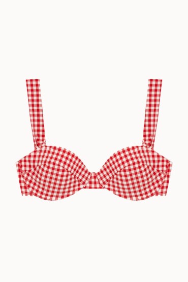 Top de Bikini Balconet en Tejido de Vichy Rojo y Blanco Nuestro icónico Top Balconet llega en su versión de cuadros vichy en rojo y blanco. Un patrón con aro y foam incorporado y lazada en la espalda para ajustarlo a...