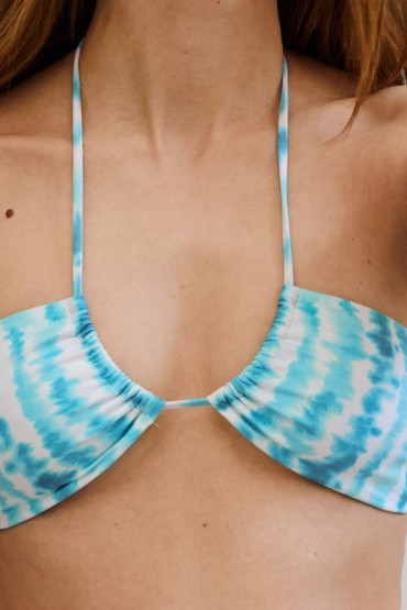 Bikini Bandeau Multiposición con Estampado Tie-Dye Azul y Blanco Confeccionado en un estampado que resalta mucho el bronceado de la piel: un tie-dye en toda la gama de azules turquesas. El Amalfi Top Moss es la nueva...